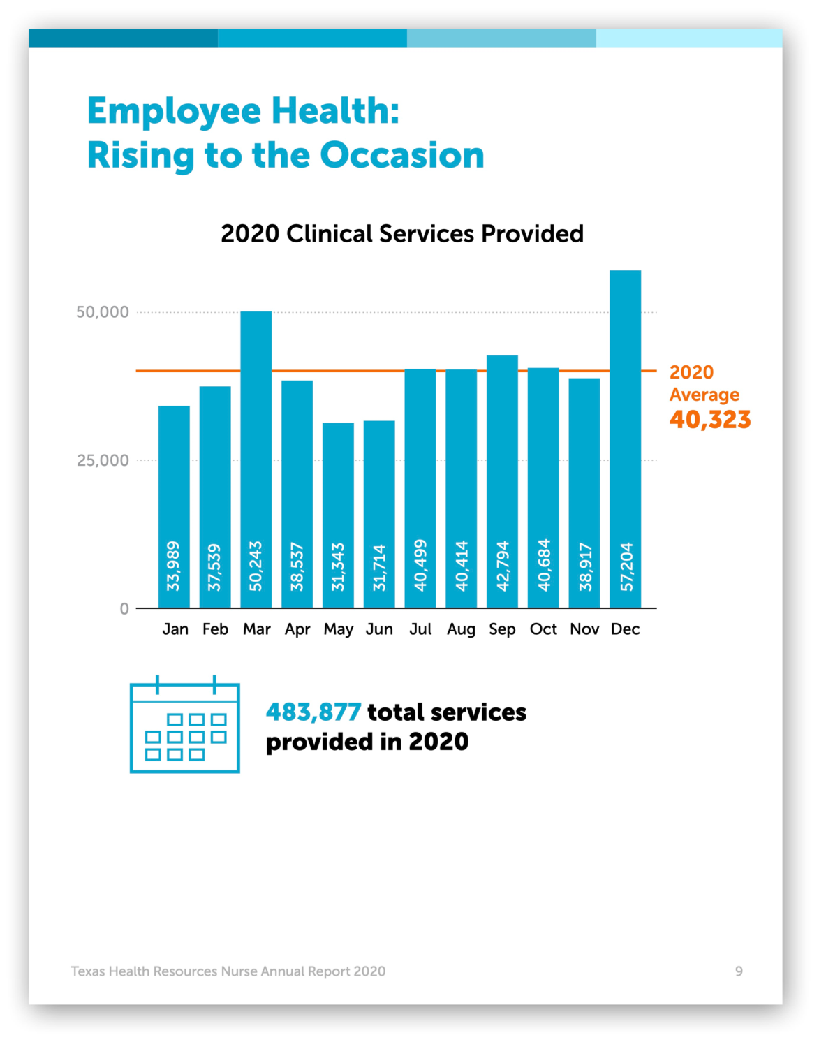 A bold report layout and data visualizations help communicate the achievements an accomplishments of these nurses to all of the employees and stakeholders.